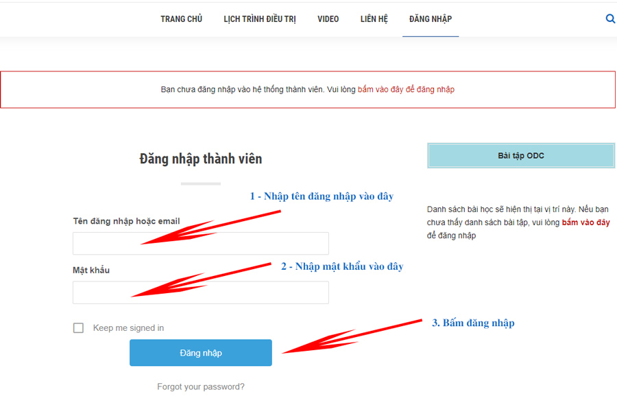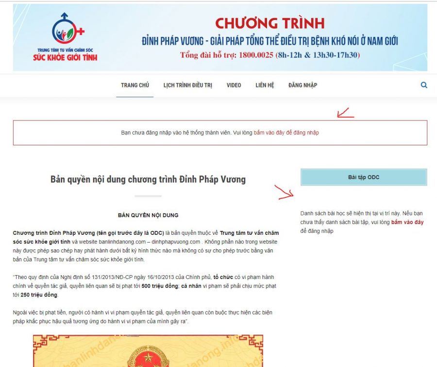 Nếu quý học viên chưa đăng nhập vào hệ thống, website sẽ hiện thị thông báo như hình dưới đây: