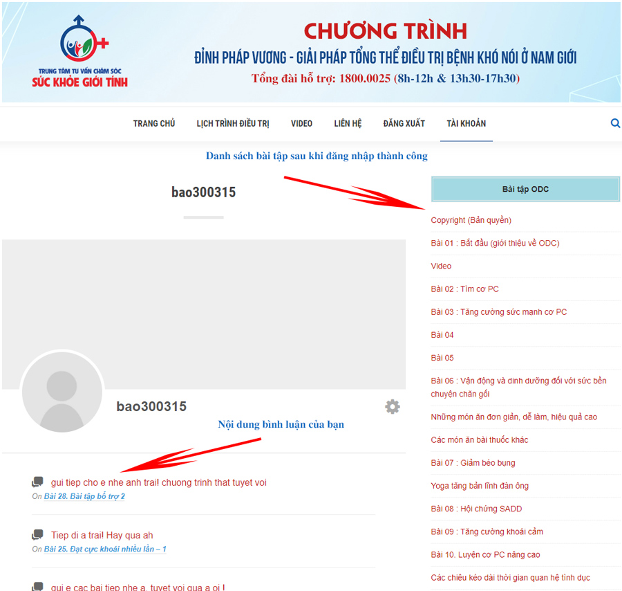 Sau khi đăng nhập thành công vào hệ thống thành viên, website tự chuyển về giao diện trang tài khoản của bạn. ở giao diện máy tính, danh sách bài tập của chương trình sẽ hiện thị ở lề bên phải màn hình, phía dưới là mục danh sách bình luận của bạn đã được ban quản trị trả lời. Ở màn hình điện thoại, các phần sẽ sắp xếp từ trên xuống dưới.
